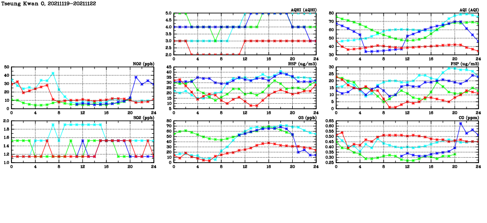 | Air Quality Data Time Series in Tseung Kwan O (2021/11/22) | ( Line colors: Day -3 Day -2 Day -1 Current day ) | 2D Map Current AQHI |