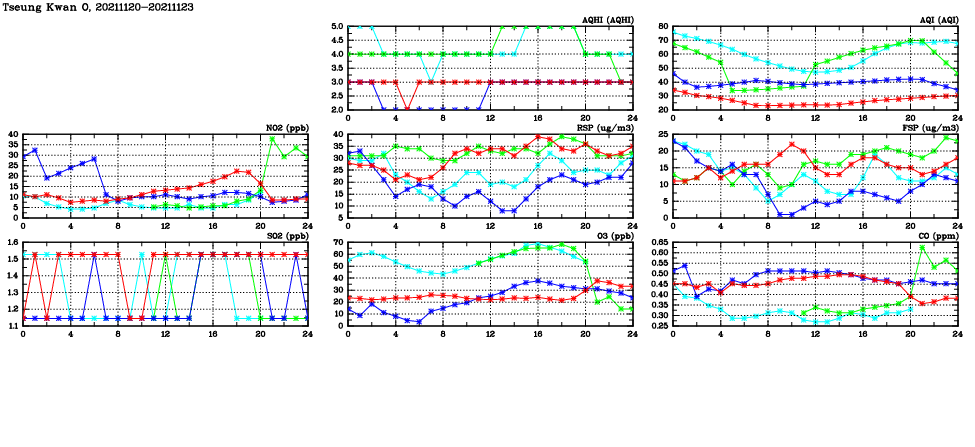 | Air Quality Data Time Series in Tseung Kwan O (2021/11/23) | ( Line colors: Day -3 Day -2 Day -1 Current day ) | 2D Map Current AQHI |