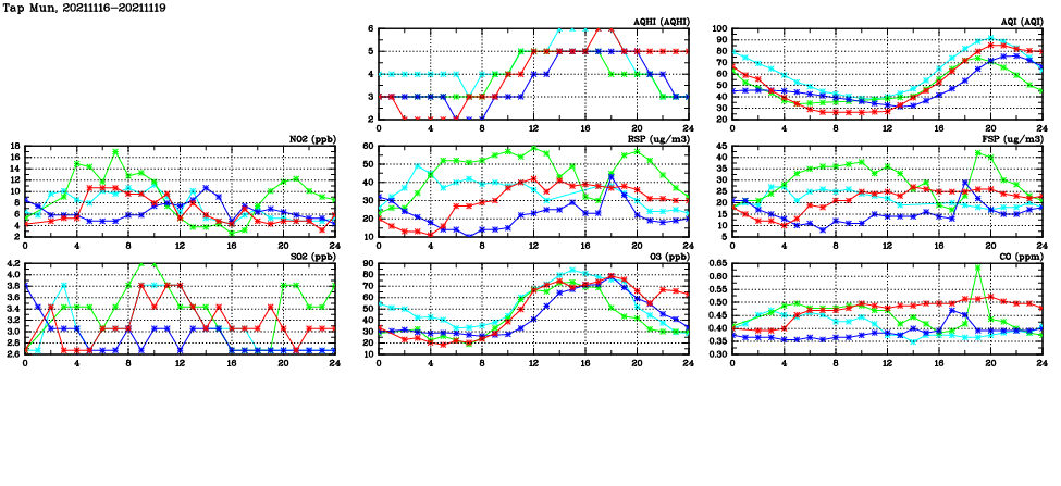 | Air Quality Data Time Series in Tap Mun (2021/11/19) | ( Line colors: Day -3 Day -2 Day -1 Current day ) | 2D Map Current AQHI |