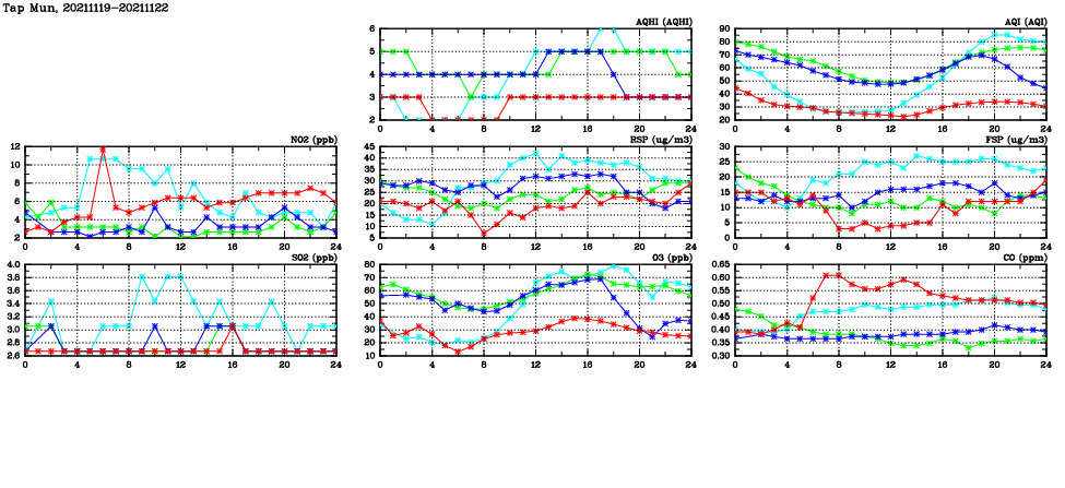 | Air Quality Data Time Series in Tap Mun (2021/11/22) | ( Line colors: Day -3 Day -2 Day -1 Current day ) | 2D Map Current AQHI |