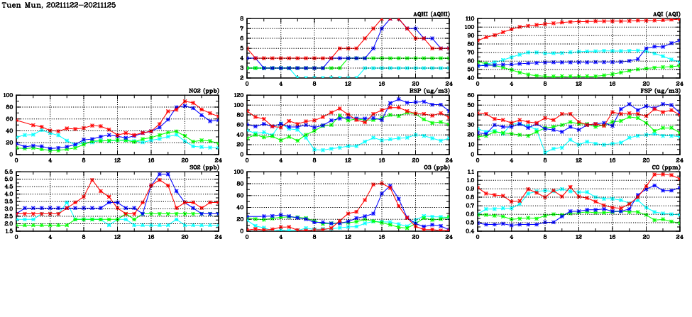 | Air Quality Data Time Series in Tuen Mun (2021/11/25) | ( Line colors: Day -3 Day -2 Day -1 Current day ) | 2D Map Current AQHI |