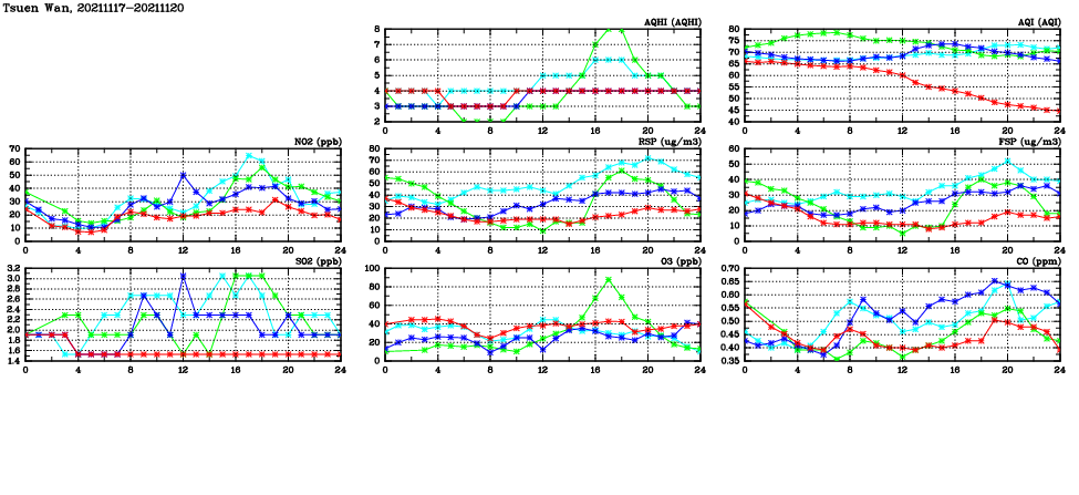 | Air Quality Data Time Series in Tsuen Wan (2021/11/20) | ( Line colors: Day -3 Day -2 Day -1 Current day ) | 2D Map Current AQHI |