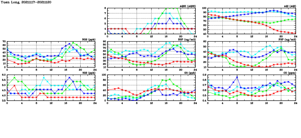 | Air Quality Data Time Series in Yuen Long (2021/11/20) | ( Line colors: Day -3 Day -2 Day -1 Current day ) | 2D Map Current AQHI |