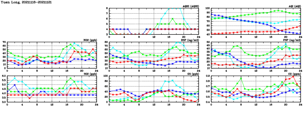 | Air Quality Data Time Series in Yuen Long (2021/11/21) | ( Line colors: Day -3 Day -2 Day -1 Current day ) | 2D Map Current AQHI |