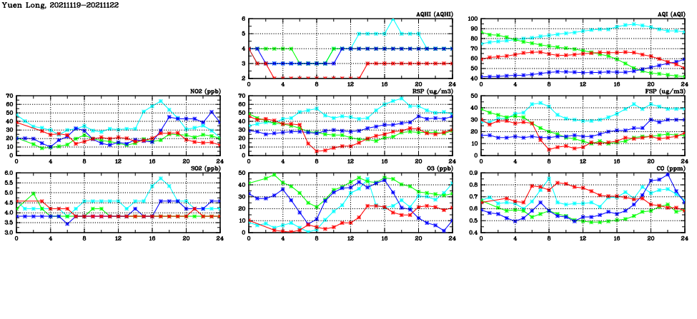| Air Quality Data Time Series in Yuen Long (2021/11/22) | ( Line colors: Day -3 Day -2 Day -1 Current day ) | 2D Map Current AQHI |