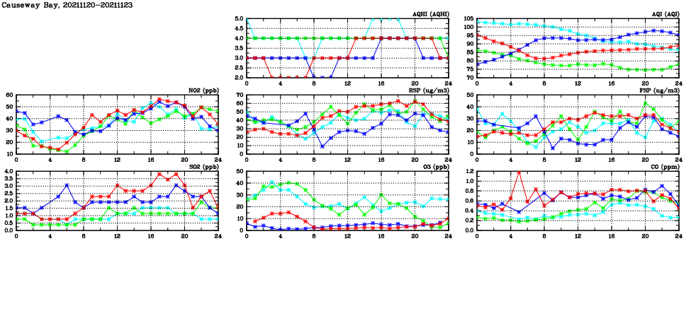 | Air Quality Data Time Series in Causeway Bay (2021/11/23) | ( Line colors: Day -3 Day -2 Day -1 Current day ) | 2D Map Current AQHI |