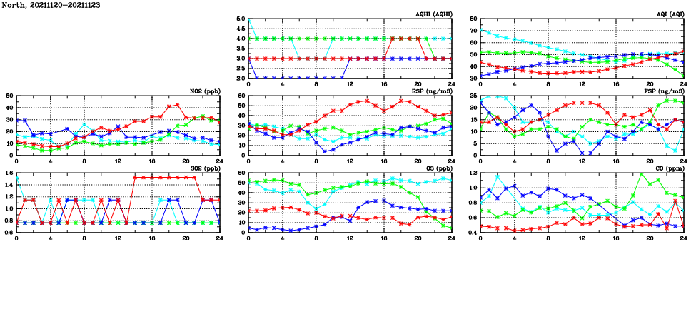 | Air Quality Data Time Series in North (2021/11/23) | ( Line colors: Day -3 Day -2 Day -1 Current day ) | 2D Map Current AQHI |