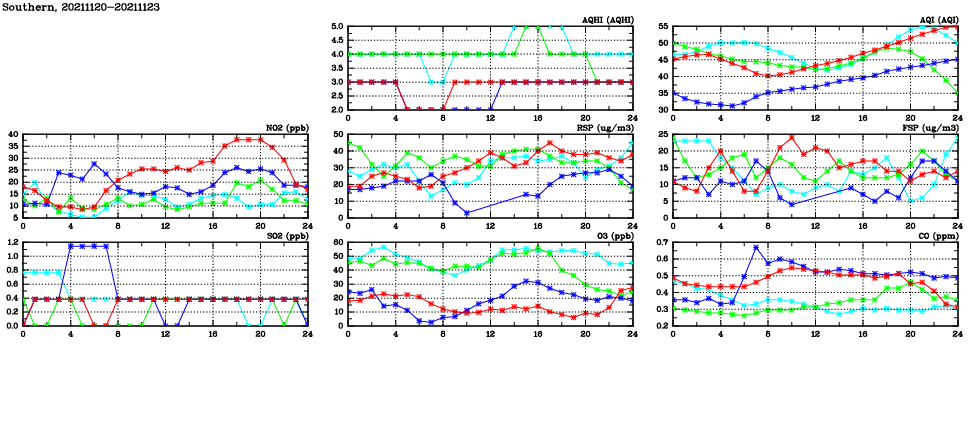 | Air Quality Data Time Series in Southern (2021/11/23) | ( Line colors: Day -3 Day -2 Day -1 Current day ) | 2D Map Current AQHI |