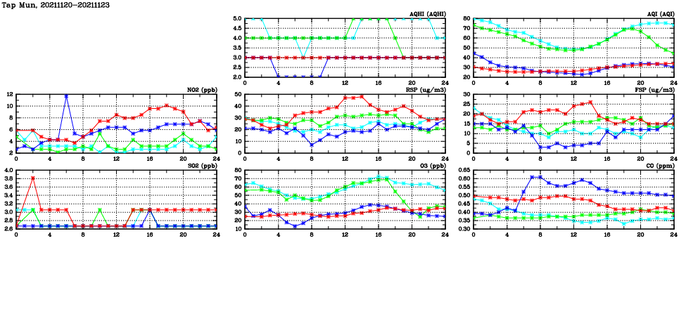 | Air Quality Data Time Series in Tap Mun (2021/11/23) | ( Line colors: Day -3 Day -2 Day -1 Current day ) | 2D Map Current AQHI |