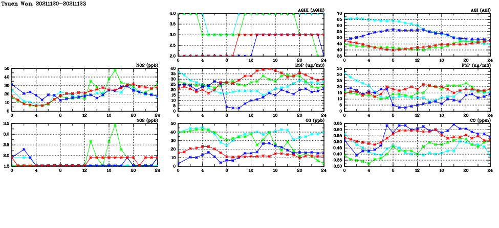 | Air Quality Data Time Series in Tsuen Wan (2021/11/23) | ( Line colors: Day -3 Day -2 Day -1 Current day ) | 2D Map Current AQHI |
