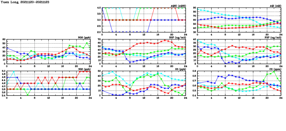 | Air Quality Data Time Series in Yuen Long (2021/11/23) | ( Line colors: Day -3 Day -2 Day -1 Current day ) | 2D Map Current AQHI |