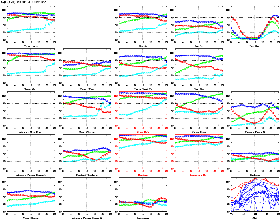 | Air Quality Data Time Series for AQI (2021/11/27) | ( Line colors: Day -3 Day -2 Day -1 Current day ) | 2D Map Current AQHI |