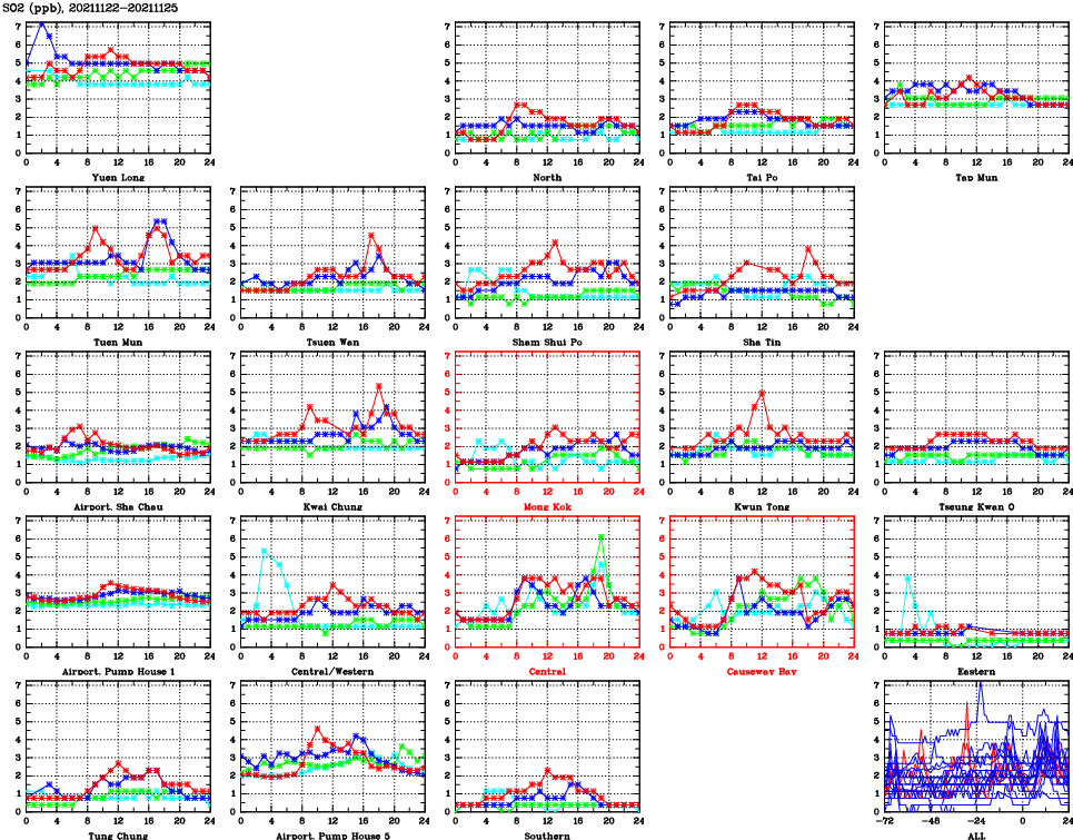 | Air Quality Data Time Series for SO2 (2021/11/25) | ( Line colors: Day -3 Day -2 Day -1 Current day ) | 2D Map Current AQHI |