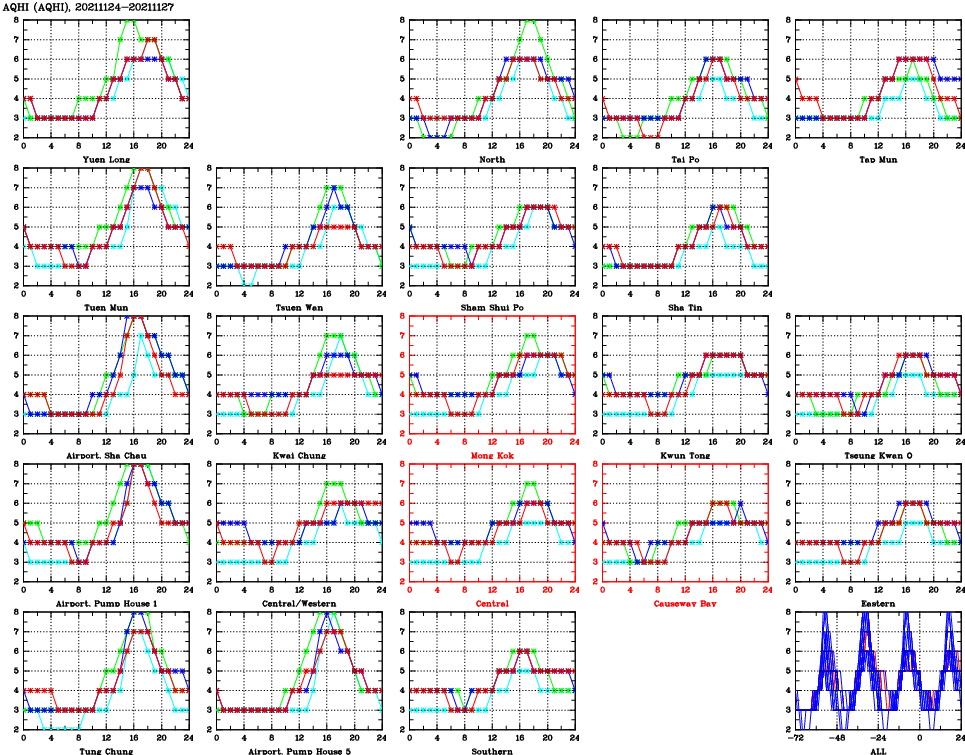 | Air Quality Data Time Series for AQHI (2021/11/27) | ( Line colors: Day -3 Day -2 Day -1 Current day ) | 2D Map Current AQHI |
