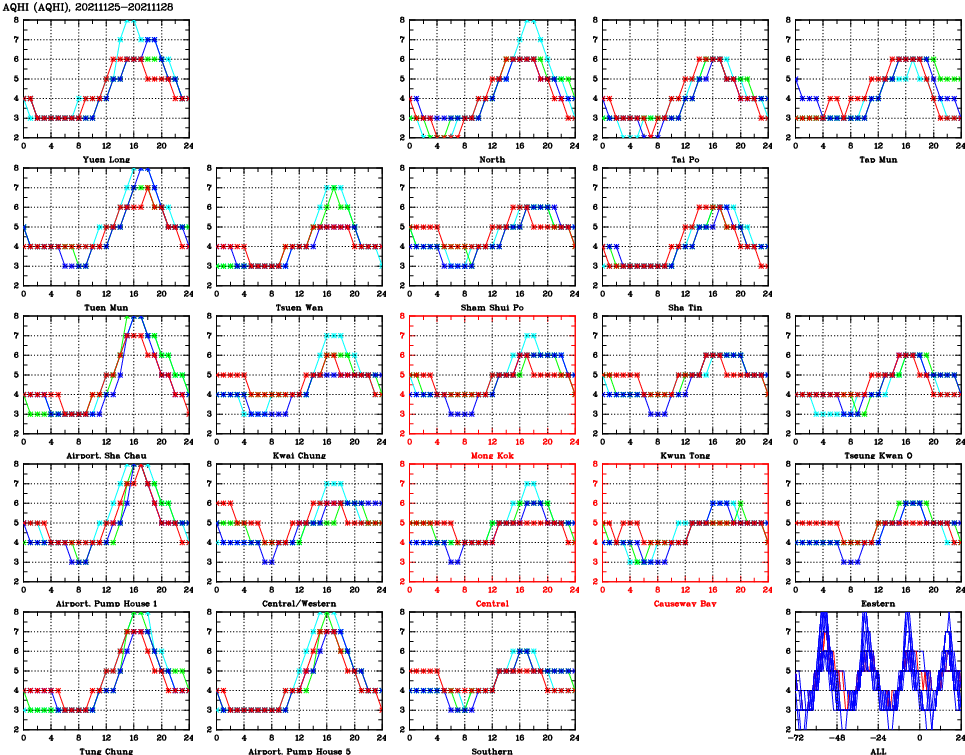 | Air Quality Data Time Series for AQHI (2021/11/28) | ( Line colors: Day -3 Day -2 Day -1 Current day ) | 2D Map Current AQHI |