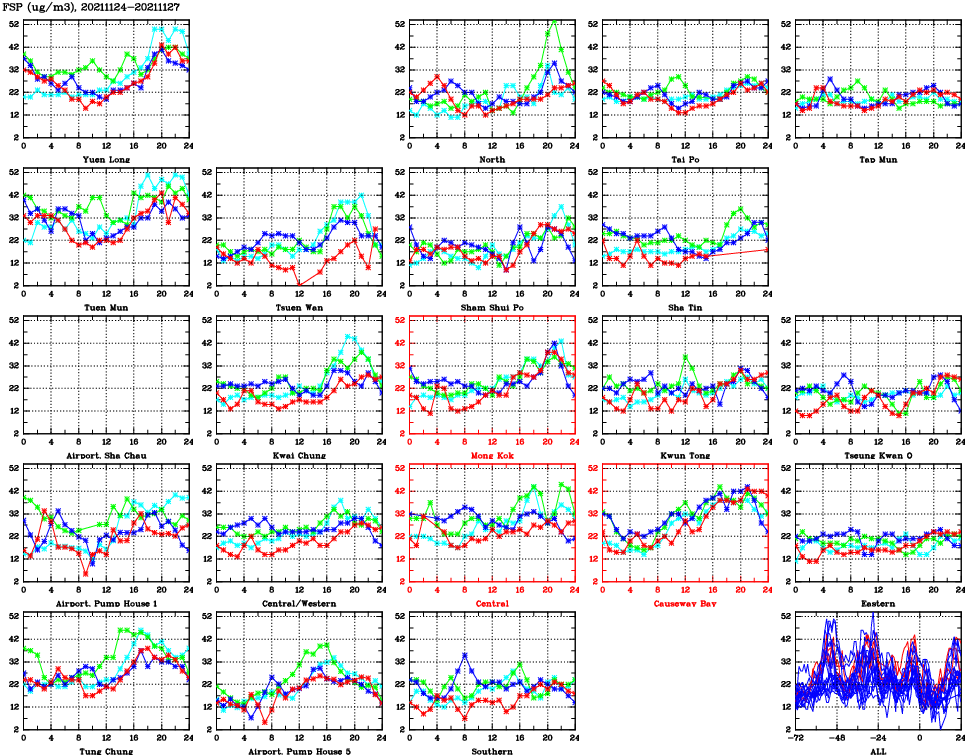 | Air Quality Data Time Series for FSP (2021/11/27) | ( Line colors: Day -3 Day -2 Day -1 Current day ) | 2D Map Current AQHI |
