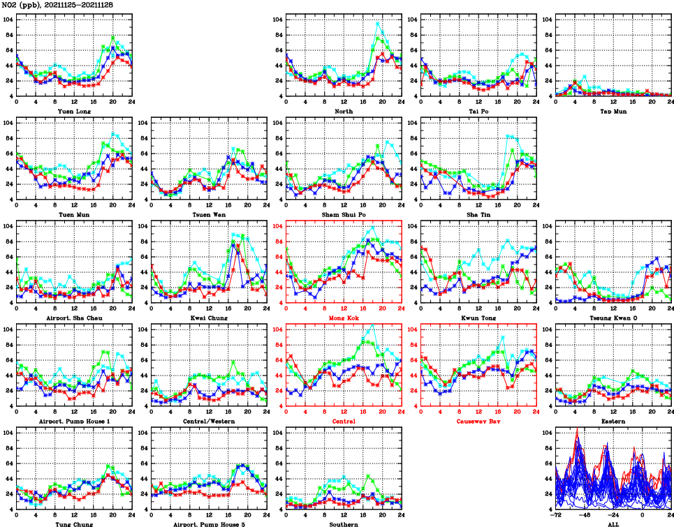 | Air Quality Data Time Series for NO2 (2021/11/28) | ( Line colors: Day -3 Day -2 Day -1 Current day ) | 2D Map Current AQHI |