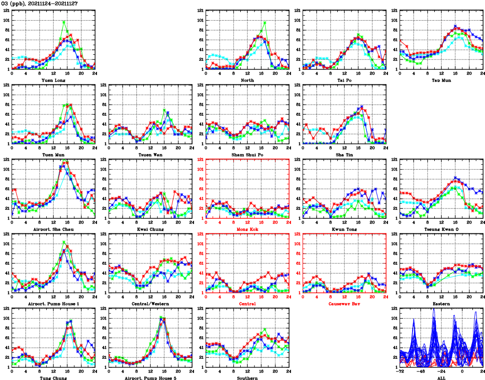 | Air Quality Data Time Series for O3 (2021/11/27) | ( Line colors: Day -3 Day -2 Day -1 Current day ) | 2D Map Current AQHI |