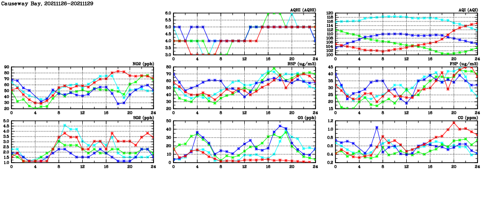 | Air Quality Data Time Series in Causeway Bay (2021/11/29) | ( Line colors: Day -3 Day -2 Day -1 Current day ) | 2D Map Current AQHI |