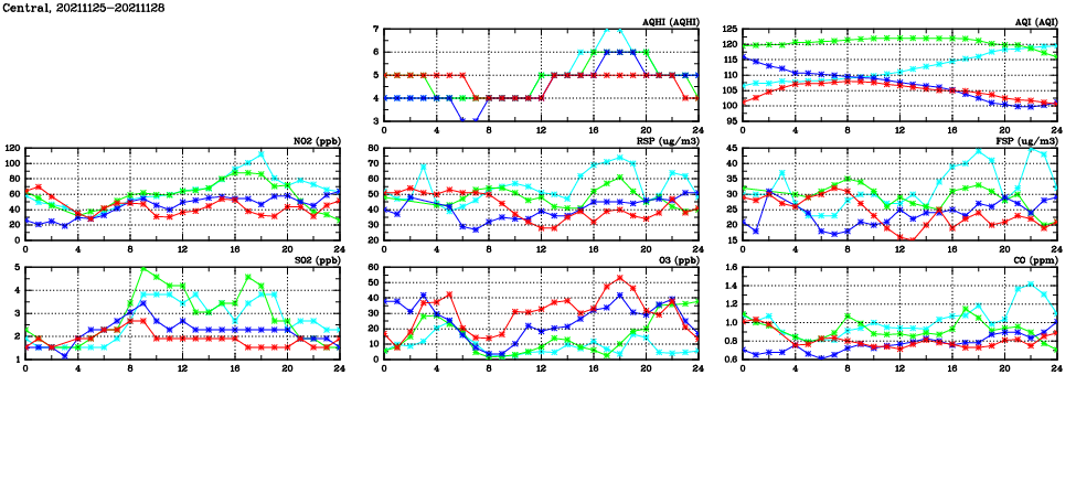 | Air Quality Data Time Series in Central (2021/11/28) | ( Line colors: Day -3 Day -2 Day -1 Current day ) | 2D Map Current AQHI |