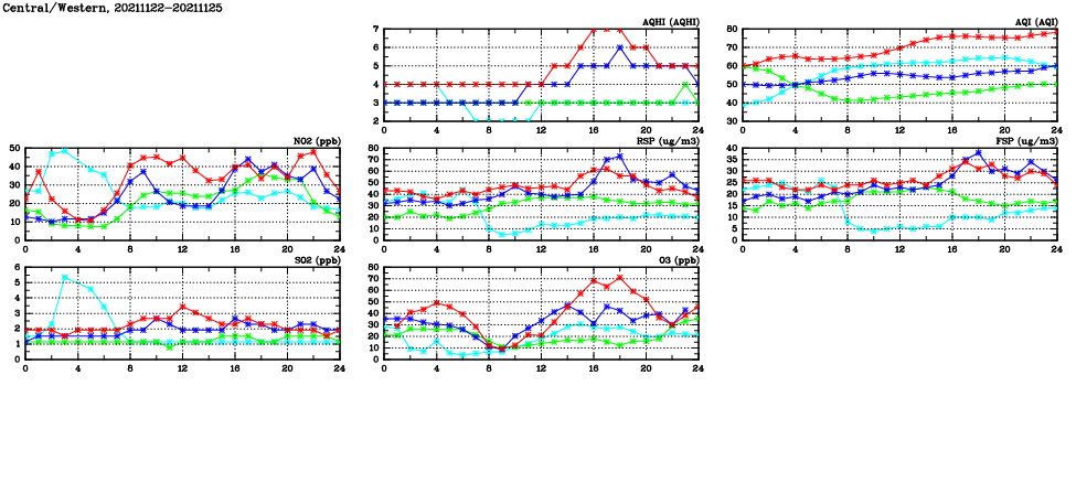 | Air Quality Data Time Series in Central/Western (2021/11/25) | ( Line colors: Day -3 Day -2 Day -1 Current day ) | 2D Map Current AQHI |
