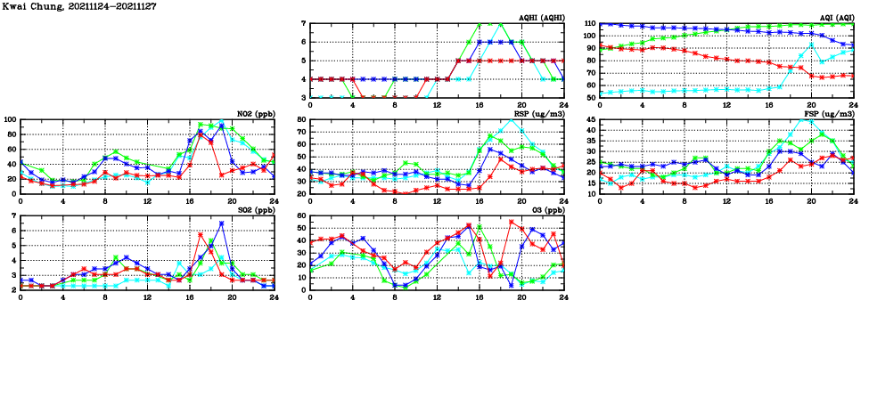 | Air Quality Data Time Series in Kwai Chung (2021/11/27) | ( Line colors: Day -3 Day -2 Day -1 Current day ) | 2D Map Current AQHI |