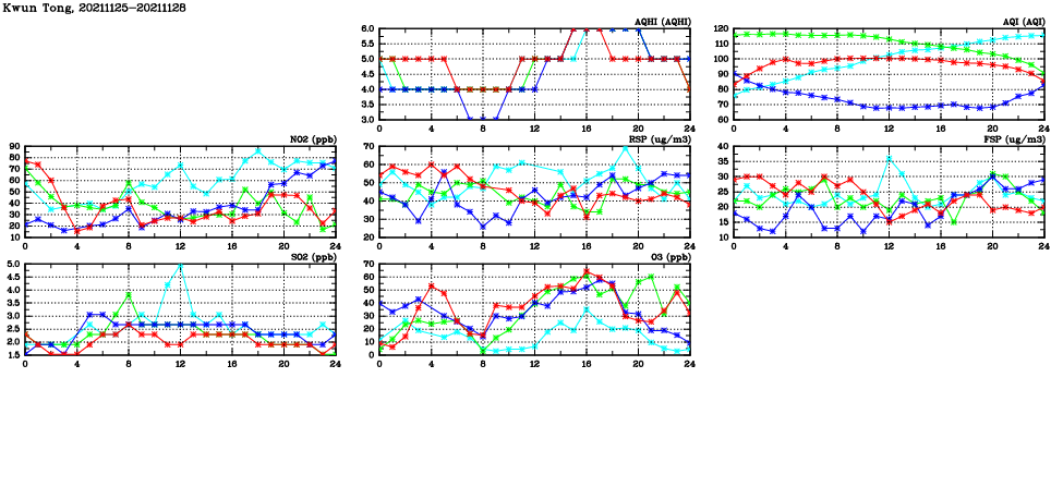 | Air Quality Data Time Series in Kwun Tong (2021/11/28) | ( Line colors: Day -3 Day -2 Day -1 Current day ) | 2D Map Current AQHI |