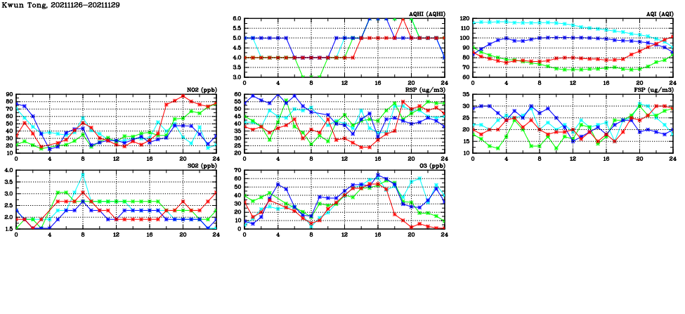 | Air Quality Data Time Series in Kwun Tong (2021/11/29) | ( Line colors: Day -3 Day -2 Day -1 Current day ) | 2D Map Current AQHI |
