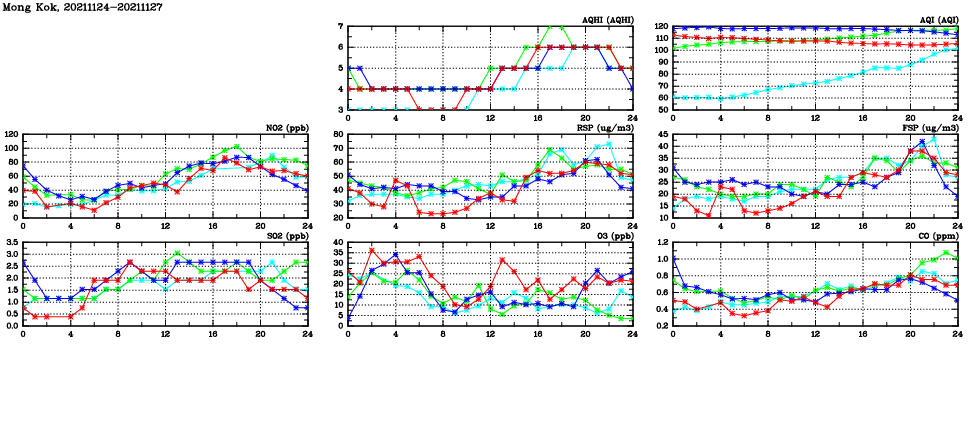 | Air Quality Data Time Series in Mong Kok (2021/11/27) | ( Line colors: Day -3 Day -2 Day -1 Current day ) | 2D Map Current AQHI |