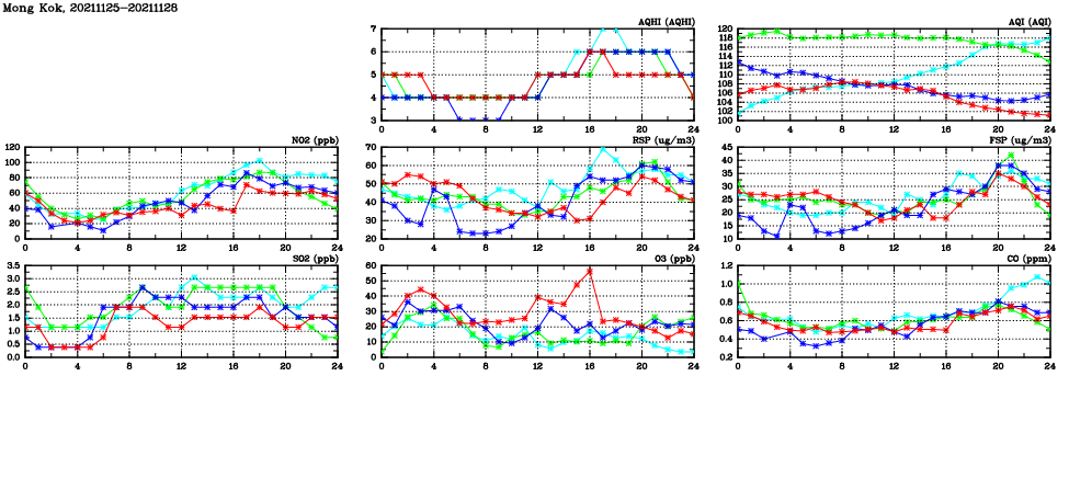 | Air Quality Data Time Series in Mong Kok (2021/11/28) | ( Line colors: Day -3 Day -2 Day -1 Current day ) | 2D Map Current AQHI |