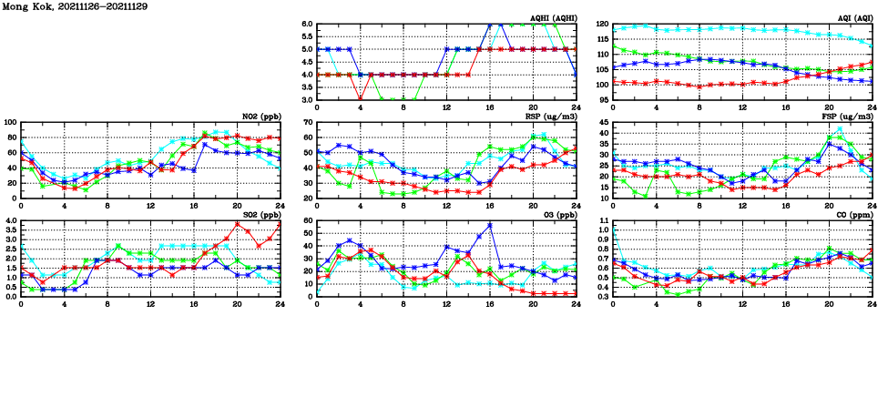 | Air Quality Data Time Series in Mong Kok (2021/11/29) | ( Line colors: Day -3 Day -2 Day -1 Current day ) | 2D Map Current AQHI |