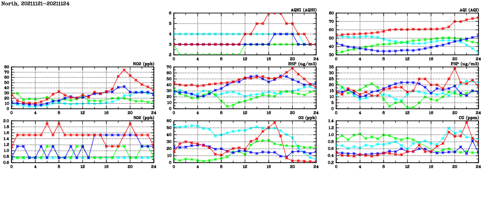 | Air Quality Data Time Series in North (2021/11/24) | ( Line colors: Day -3 Day -2 Day -1 Current day ) | 2D Map Current AQHI |