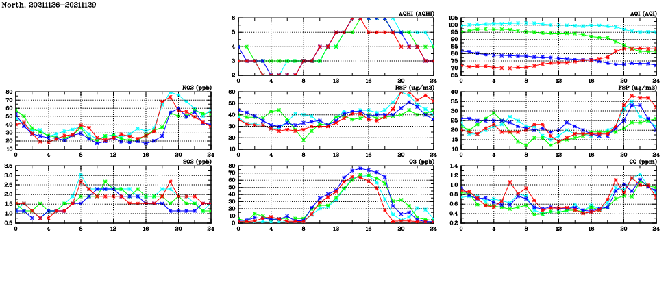 | Air Quality Data Time Series in North (2021/11/29) | ( Line colors: Day -3 Day -2 Day -1 Current day ) | 2D Map Current AQHI |