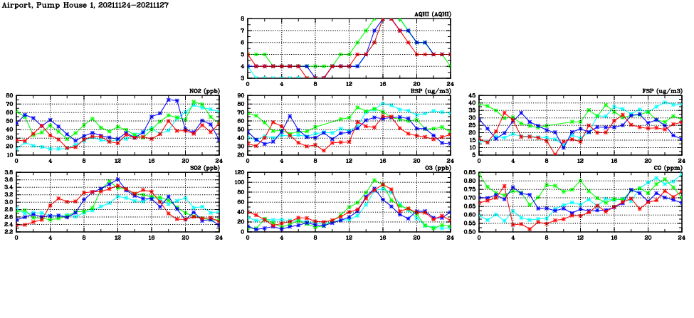 | Air Quality Data Time Series in Airport, Pump House 1 (2021/11/27) | ( Line colors: Day -3 Day -2 Day -1 Current day ) | 2D Map Current AQHI |