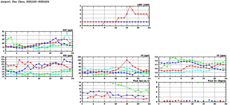 | Air Quality Data Time Series in Airport, Sha Chau (2021/11/24) | ( Line colors: Day -3 Day -2 Day -1 Current day ) | 2D Map Current AQHI |