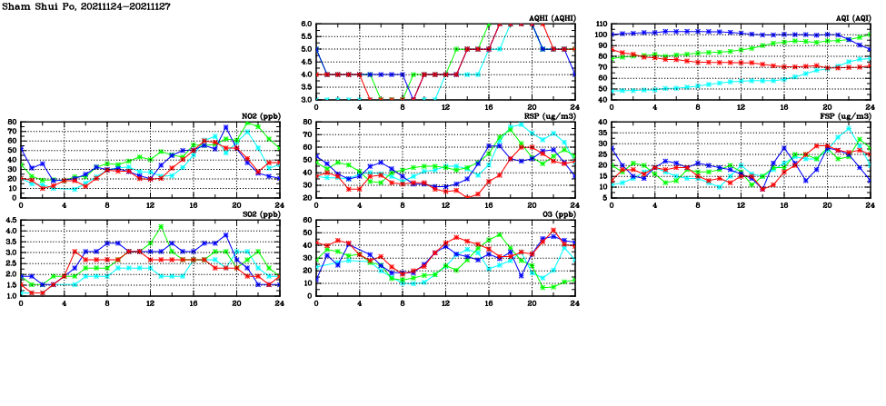 | Air Quality Data Time Series in Sham Shui Po (2021/11/27) | ( Line colors: Day -3 Day -2 Day -1 Current day ) | 2D Map Current AQHI |