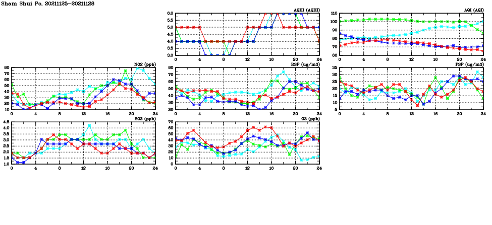 | Air Quality Data Time Series in Sham Shui Po (2021/11/28) | ( Line colors: Day -3 Day -2 Day -1 Current day ) | 2D Map Current AQHI |