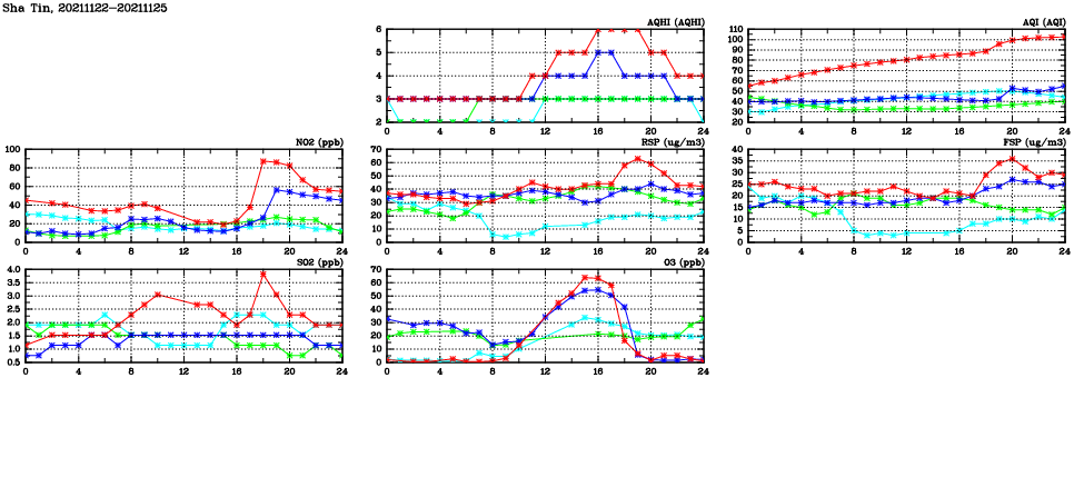 | Air Quality Data Time Series in Sha Tin (2021/11/25) | ( Line colors: Day -3 Day -2 Day -1 Current day ) | 2D Map Current AQHI |