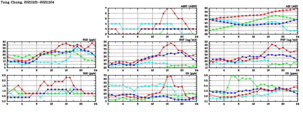 | Air Quality Data Time Series in Tung Chung (2021/11/24) | ( Line colors: Day -3 Day -2 Day -1 Current day ) | 2D Map Current AQHI |