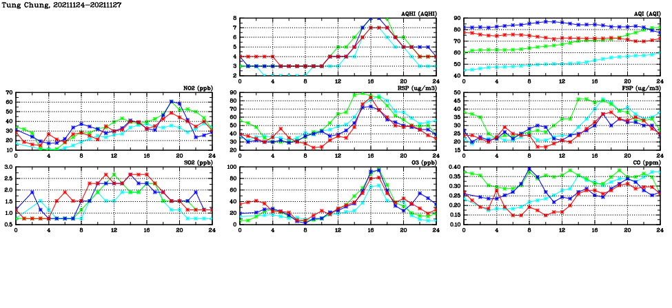 | Air Quality Data Time Series in Tung Chung (2021/11/27) | ( Line colors: Day -3 Day -2 Day -1 Current day ) | 2D Map Current AQHI |