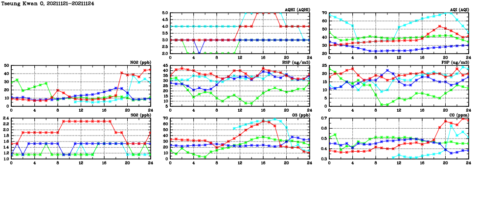 | Air Quality Data Time Series in Tseung Kwan O (2021/11/24) | ( Line colors: Day -3 Day -2 Day -1 Current day ) | 2D Map Current AQHI |