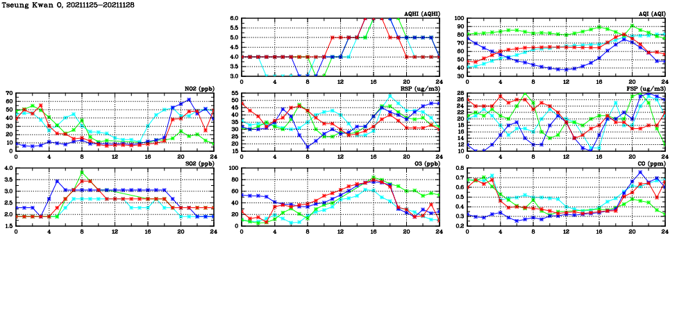 | Air Quality Data Time Series in Tseung Kwan O (2021/11/28) | ( Line colors: Day -3 Day -2 Day -1 Current day ) | 2D Map Current AQHI |