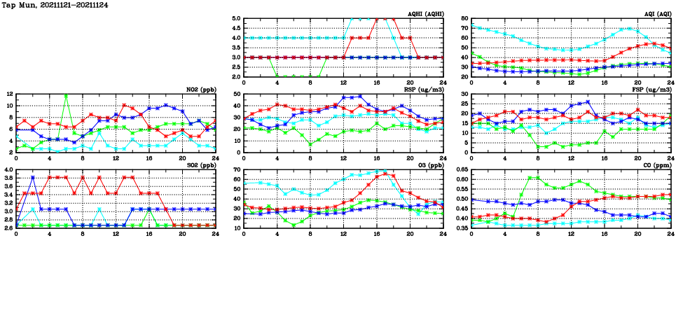 | Air Quality Data Time Series in Tap Mun (2021/11/24) | ( Line colors: Day -3 Day -2 Day -1 Current day ) | 2D Map Current AQHI |