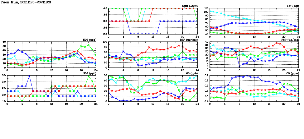 | Air Quality Data Time Series in Tuen Mun (2021/11/23) | ( Line colors: Day -3 Day -2 Day -1 Current day ) | 2D Map Current AQHI |
