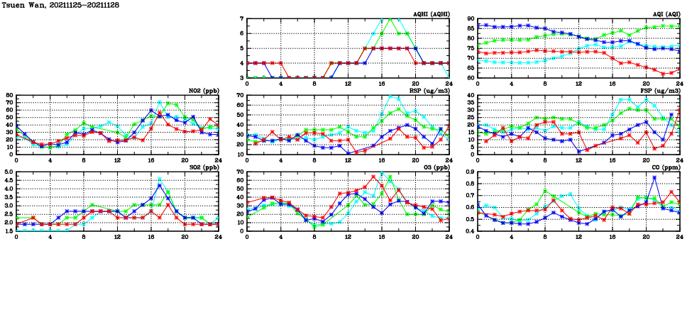 | Air Quality Data Time Series in Tsuen Wan (2021/11/28) | ( Line colors: Day -3 Day -2 Day -1 Current day ) | 2D Map Current AQHI |