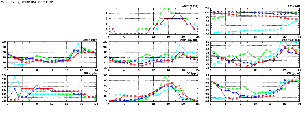 | Air Quality Data Time Series in Yuen Long (2021/11/27) | ( Line colors: Day -3 Day -2 Day -1 Current day ) | 2D Map Current AQHI |