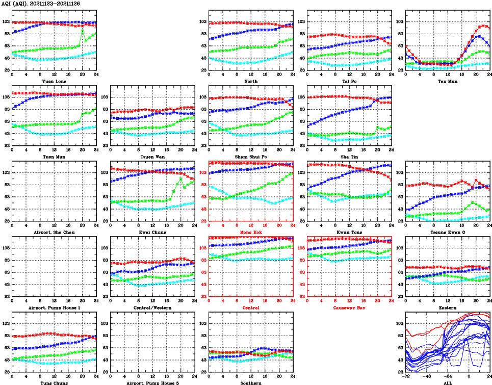 | Air Quality Data Time Series for AQI (2021/11/26) | ( Line colors: Day -3 Day -2 Day -1 Current day ) | 2D Map Current AQHI |