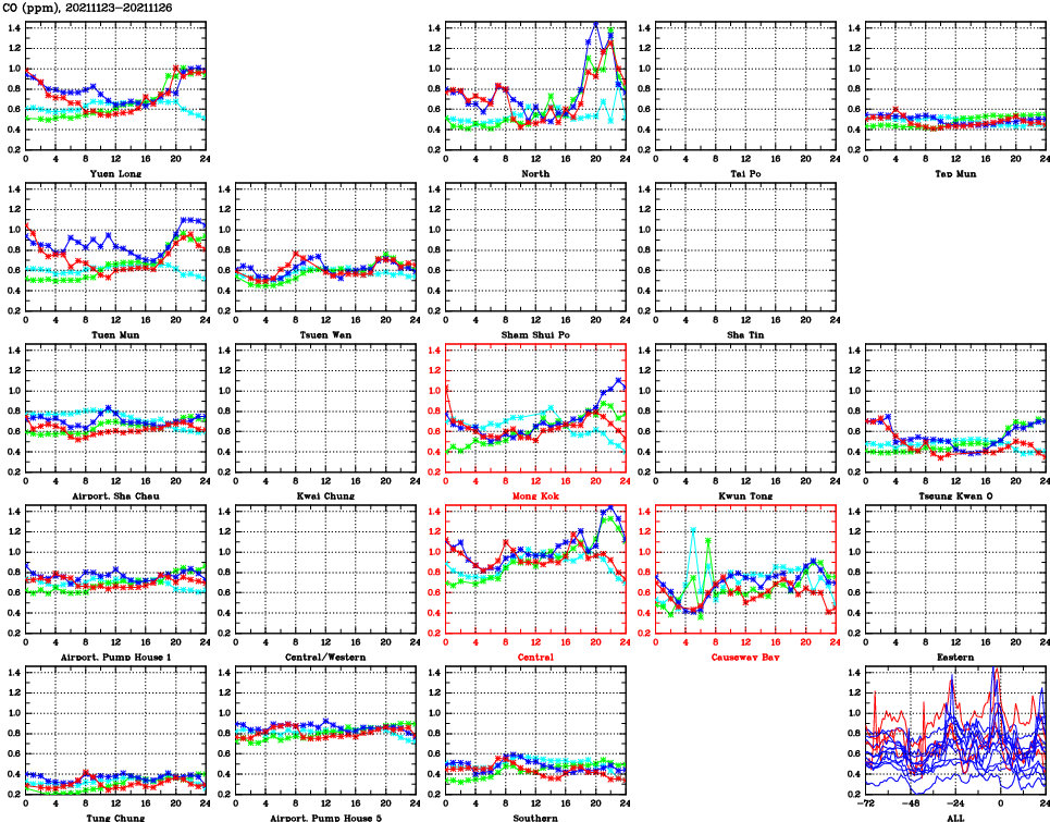 | Air Quality Data Time Series for CO (2021/11/26) | ( Line colors: Day -3 Day -2 Day -1 Current day ) | 2D Map Current AQHI |
