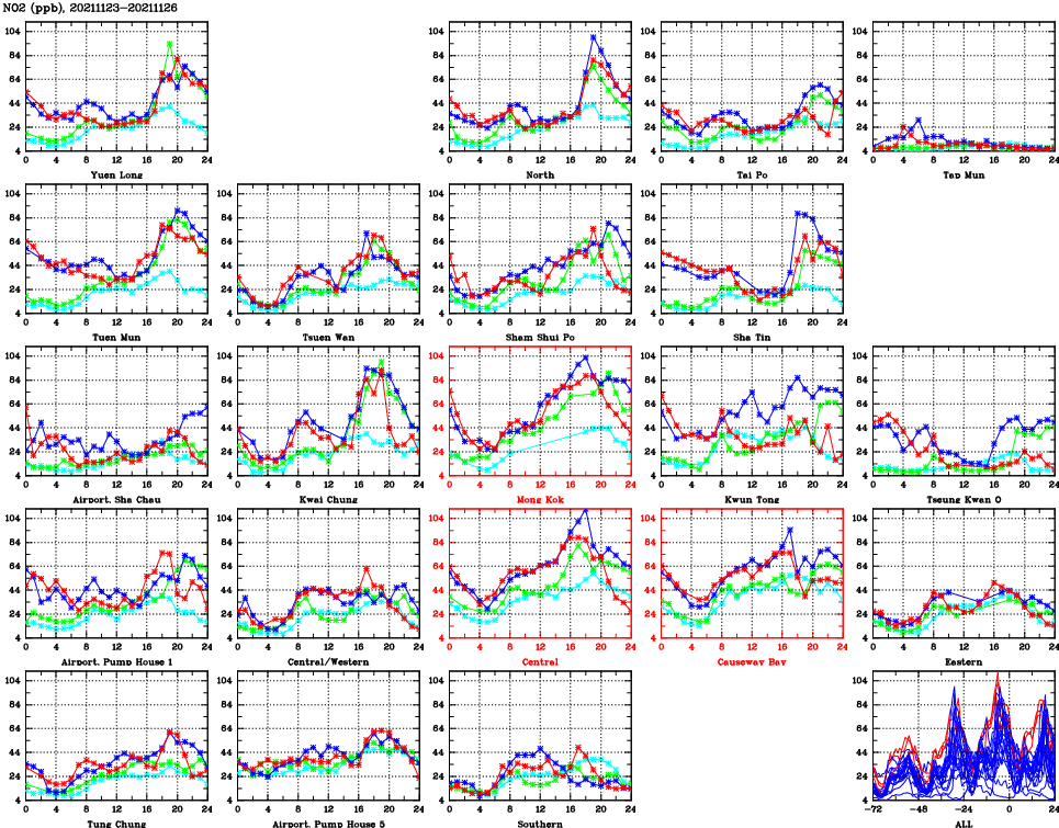 | Air Quality Data Time Series for NO2 (2021/11/26) | ( Line colors: Day -3 Day -2 Day -1 Current day ) | 2D Map Current AQHI |