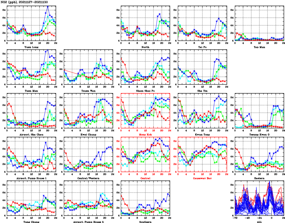 | Air Quality Data Time Series for NO2 (2021/11/30) | ( Line colors: Day -3 Day -2 Day -1 Current day ) | 2D Map Current AQHI |